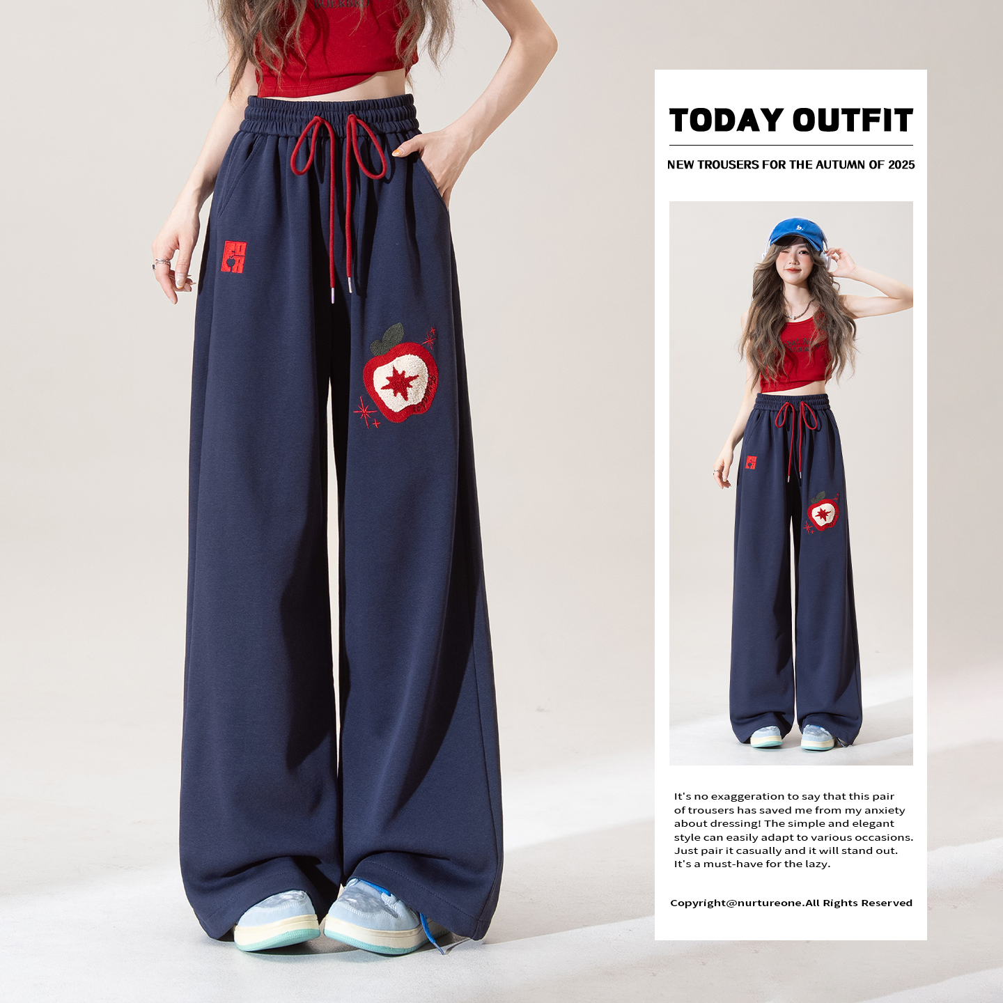 Navy Apple embroidery high-waisted drawstring casual sweatpants women's new loose straight wide-leg sweatpants for autumn