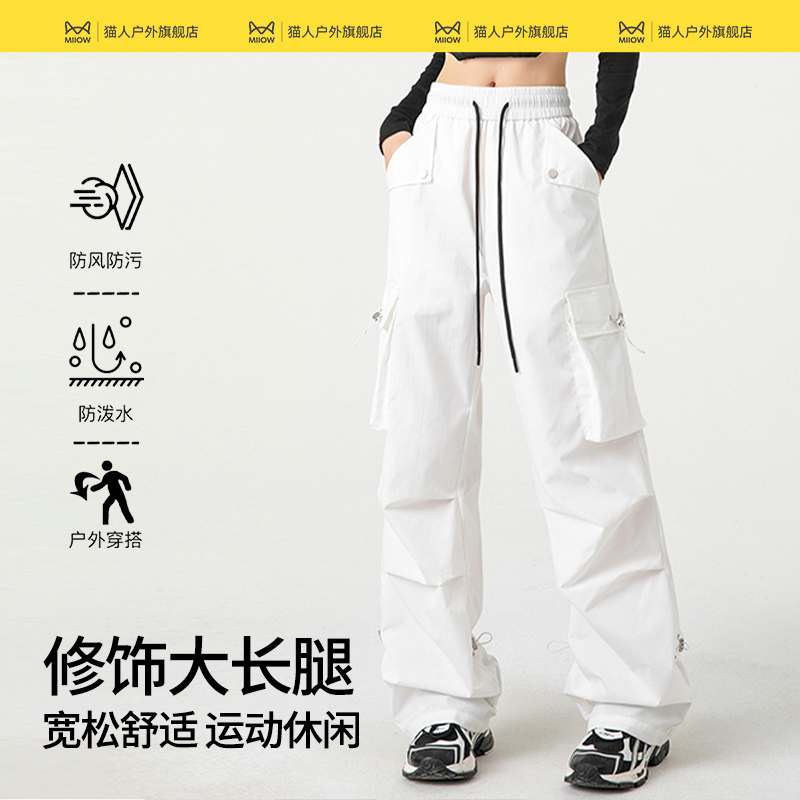 Cat man three-proof white charging cargo pants for women in autumn and winter fleece to keep warm for small people outdoor windproof and waterproof hiking pants