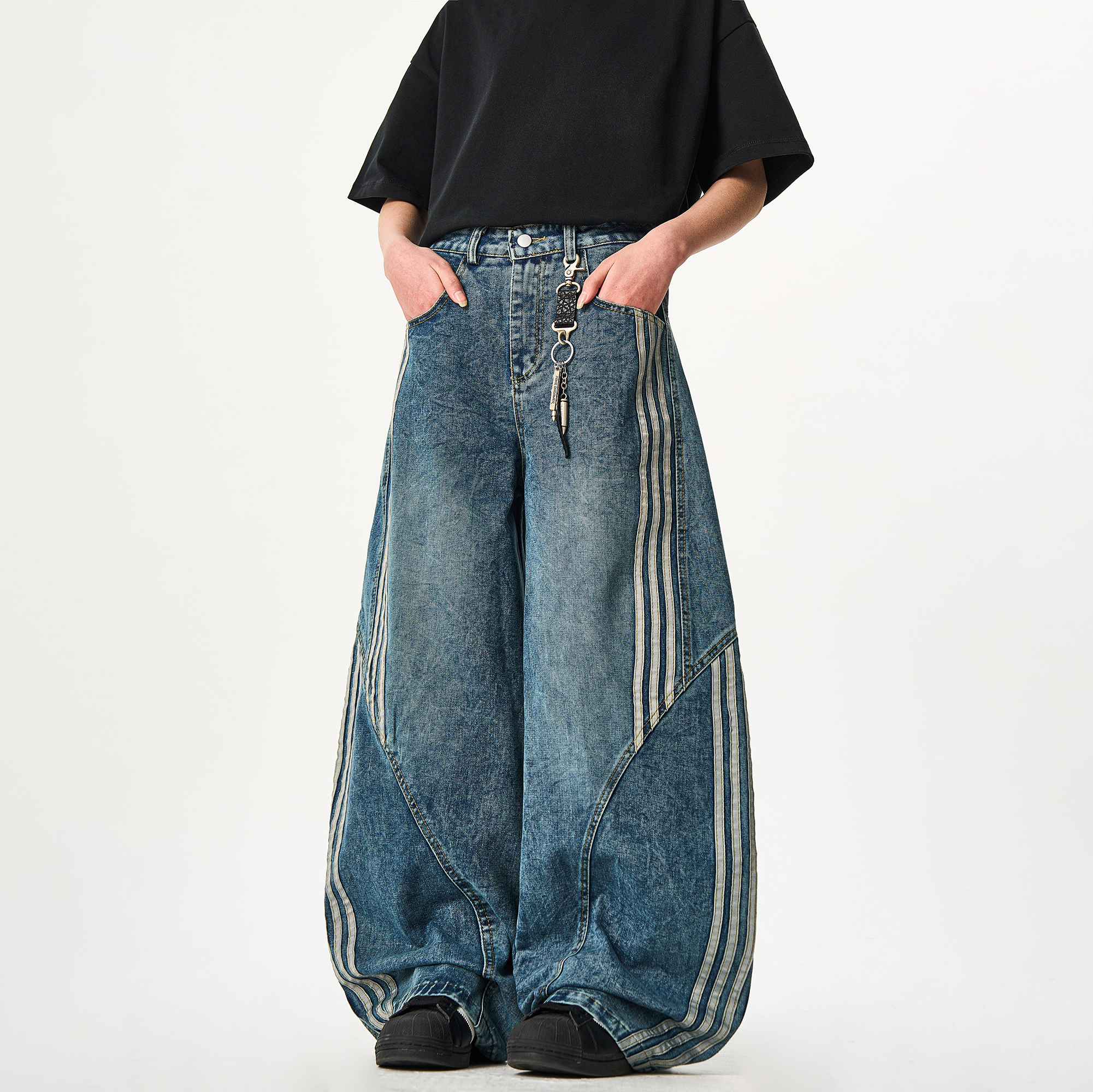 Woostop washed three-bar blue scimitar jeans for men and women loose American striped wide-leg pants baggy pants