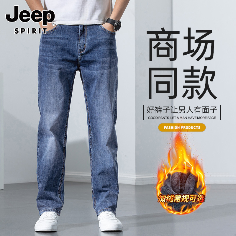 Jeep official men's jeans loose straight 2025 new fall and winter fleece thickened wide-leg casual trousers