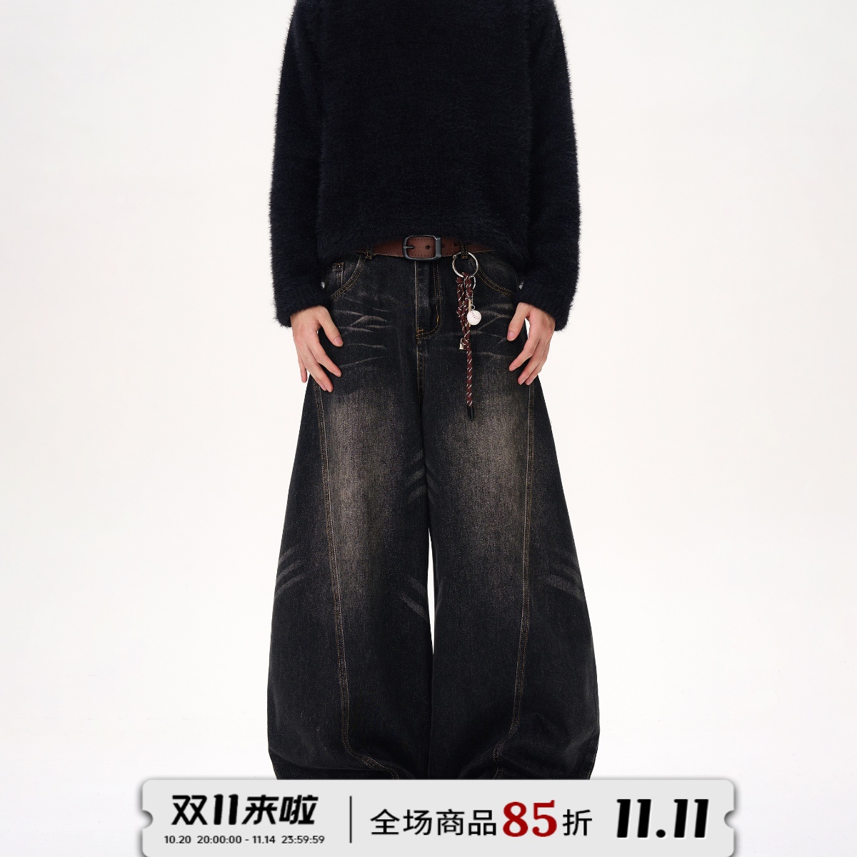 KISKO American vintage washed cat whiskers black scimitar jeans men's and women's wide legs loose drape old-fashioned pants