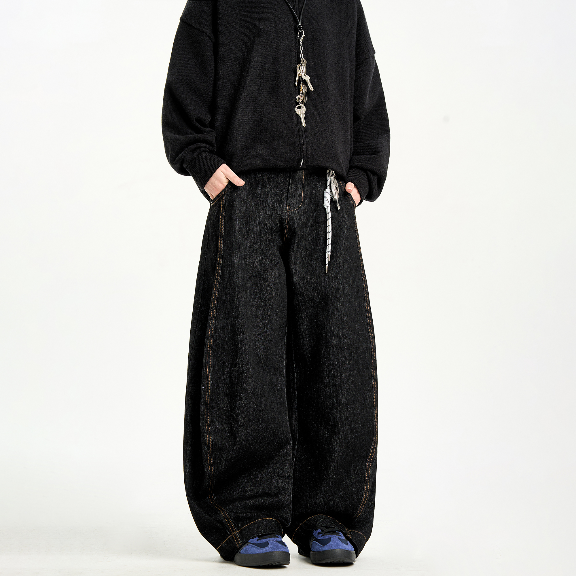 Black jeans, men's autumn American trendy brand cleanfit, loose wide-leg pants, high street pleated design trousers