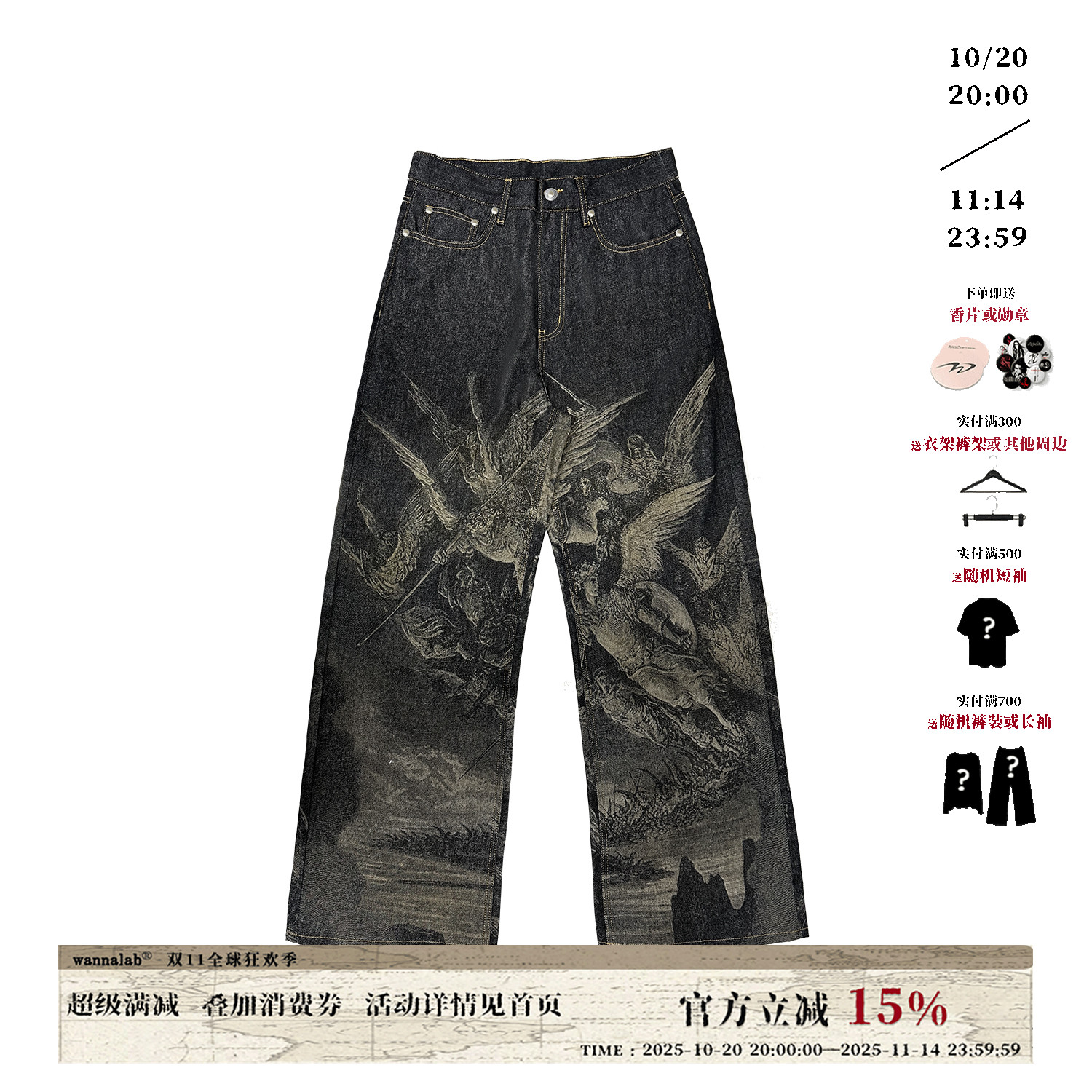 WANNA LAB 25SS "Paradise Lost" laser burnt flower baggy original denim trousers with horn nail python leather brand