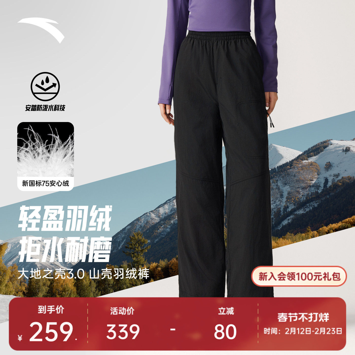 Anta Mountain Shell Down Pants丨Shell of the Earth 3.0 Outdoor Straight-leg Pants Women's Pants Winter Wide-leg Pants Plus Fleece Pants