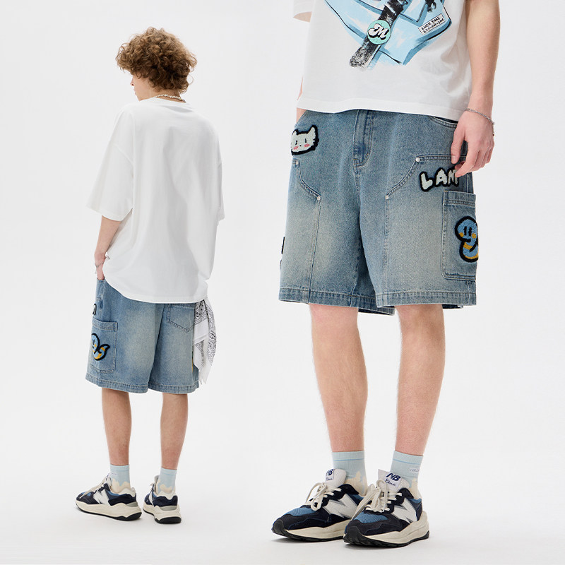 LAMLICKA patch embroidered lumberjack denim shorts men's summer loose blue trendy brand American straight cropped pants