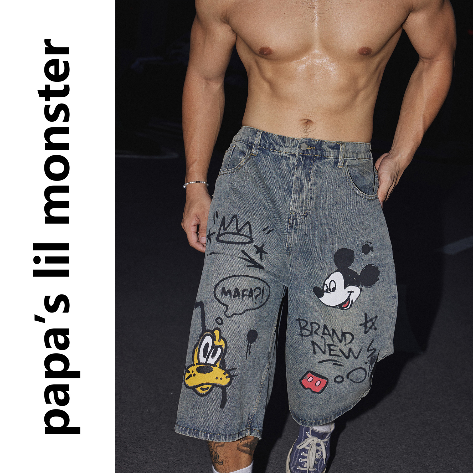 Cartoon Land American Retro Street Graffiti Print Denim Shorts Men's Summer Loose Straight Cropped Pants Trend