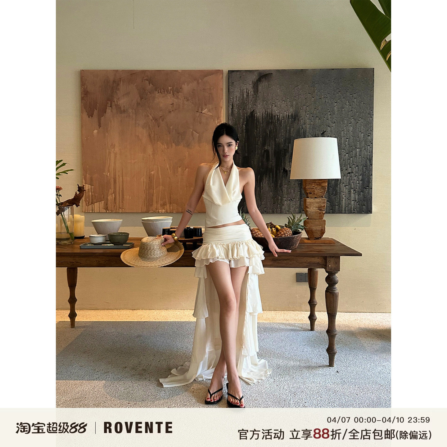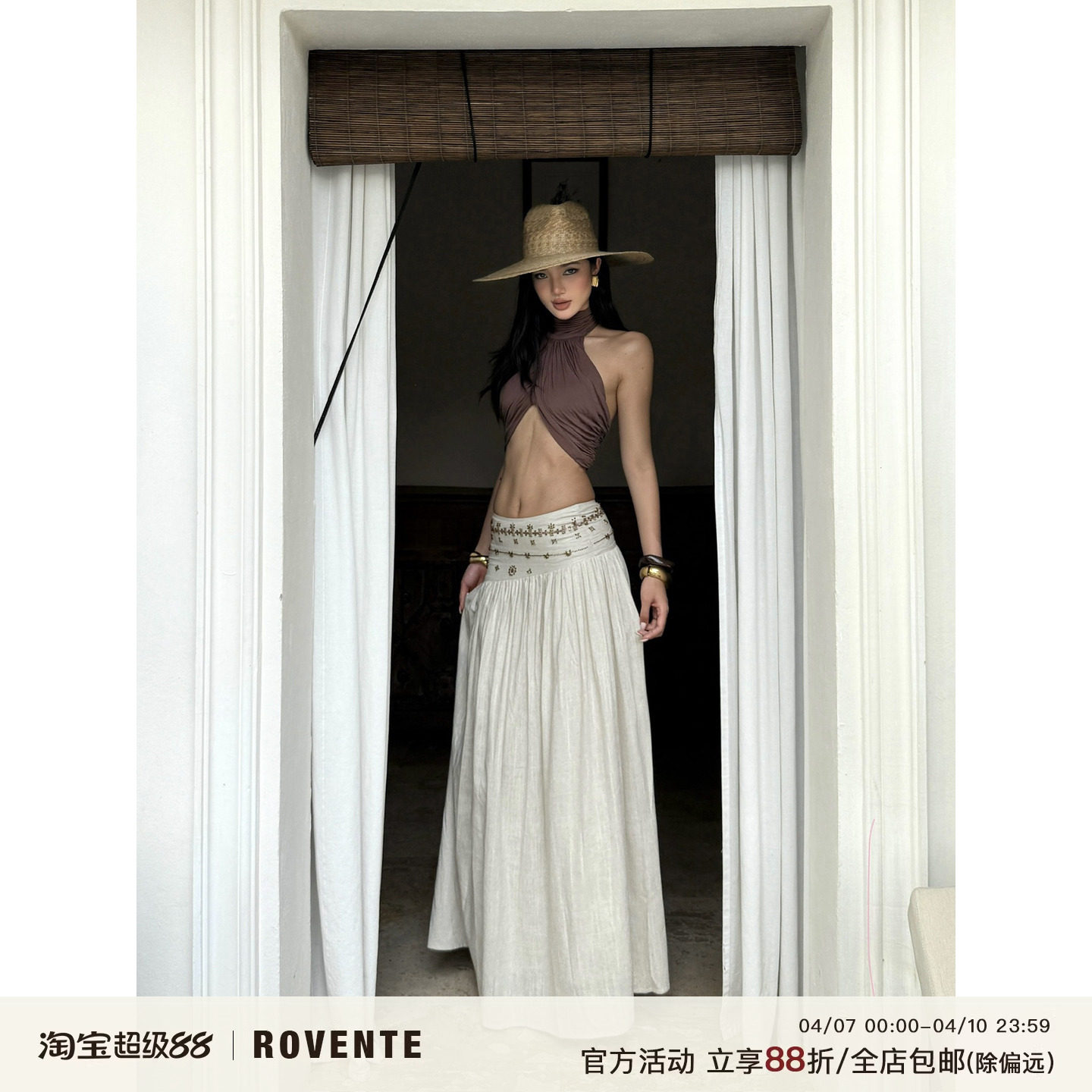 rovente Bohi Resort off-white A-line skirt women's spring thin skirt holiday vintage low-waisted long skirt