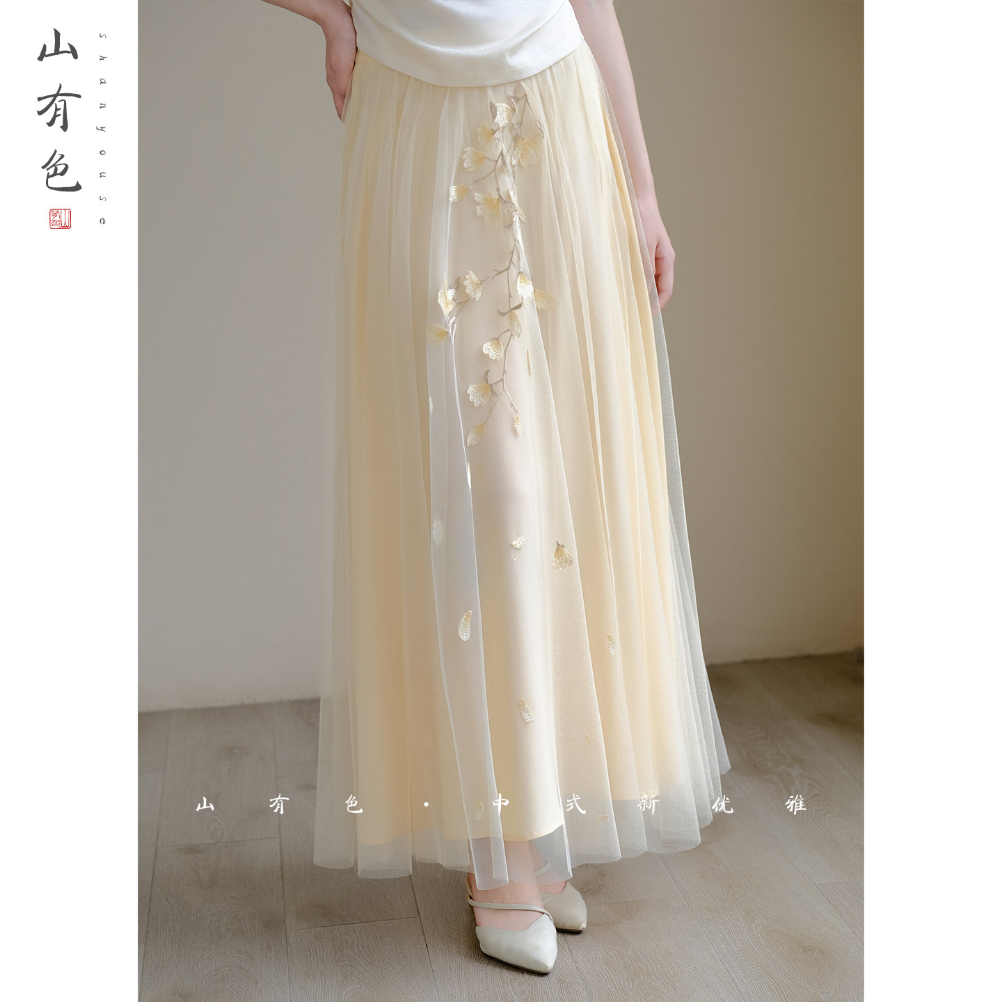 Mountain colored floating flowers reflect the boundary 2025 new Chinese summer new national style heavy industry three-dimensional embroidered mesh skirt