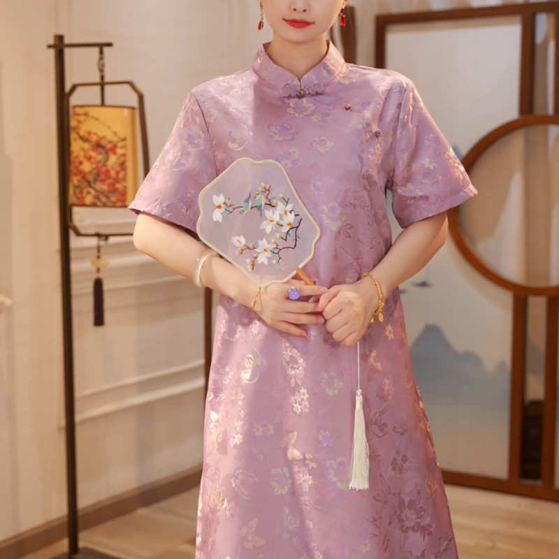 Qing - full open placket stand-up collar printed improved cheongsam dress women's mid-length skirt