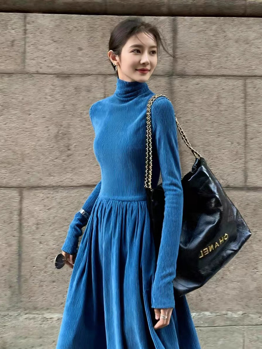 Autumn and winter blue semi-turtleneck knitted dress, female beautiful royal sister wears a sense of atmosphere, formal occasion exquisite skirt