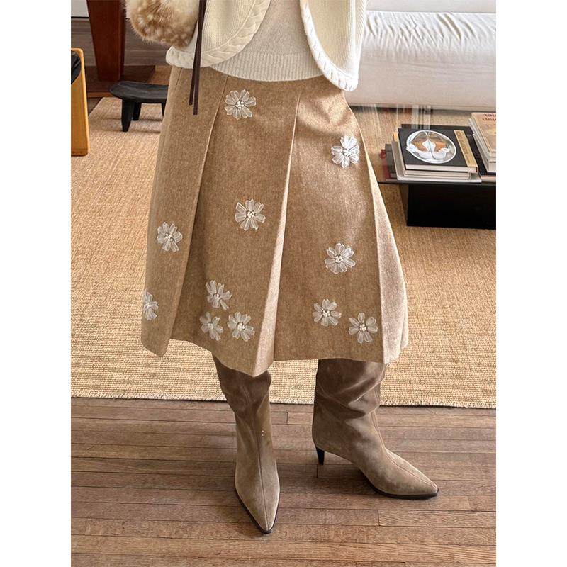 French vintage style flower embroidered skirt Winter 2025 new high-waisted slimming A-line midi skirt khaki