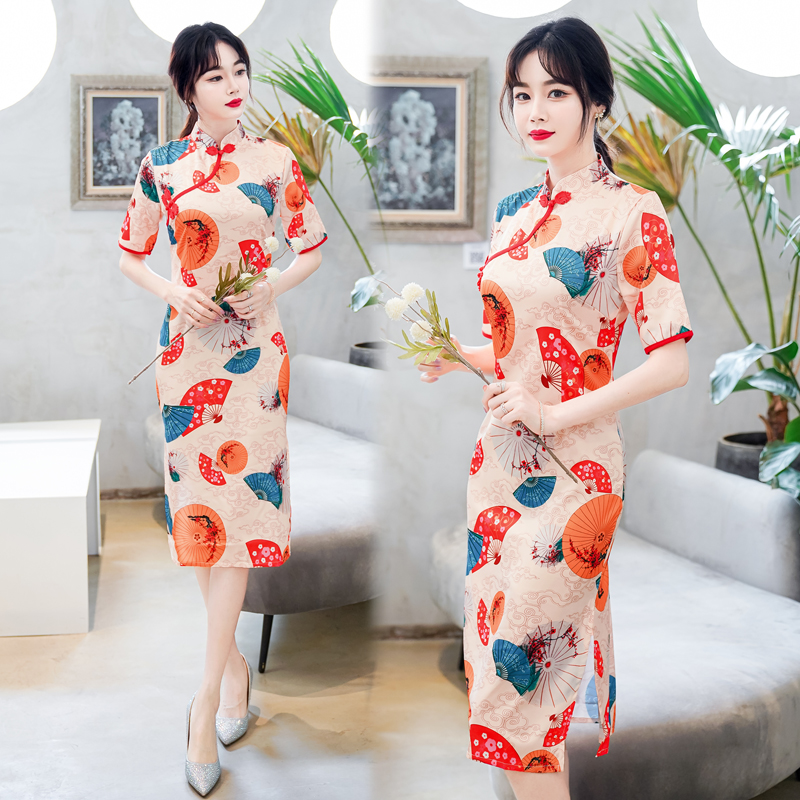093 vintage printed cotton and linen dress women's summer new Chinese style diagonal placket buckle linen improved cheongsam skirt