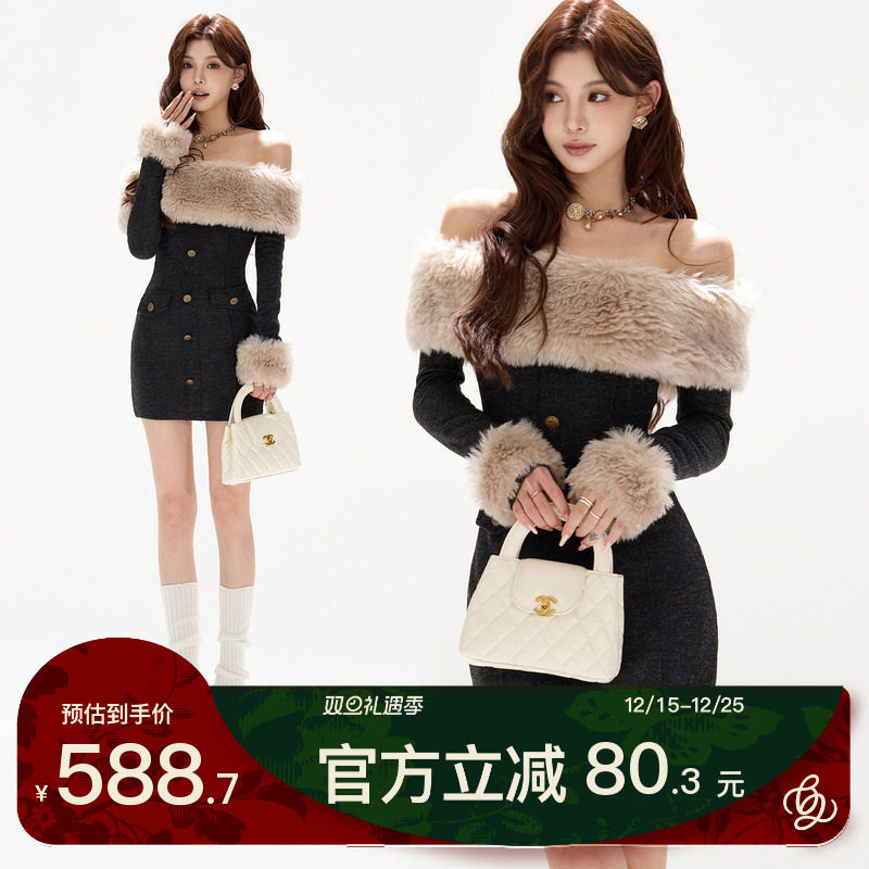 CYNR original design rich daughter sexy fur collar one-shoulder dress slim slim hip knitted skirt