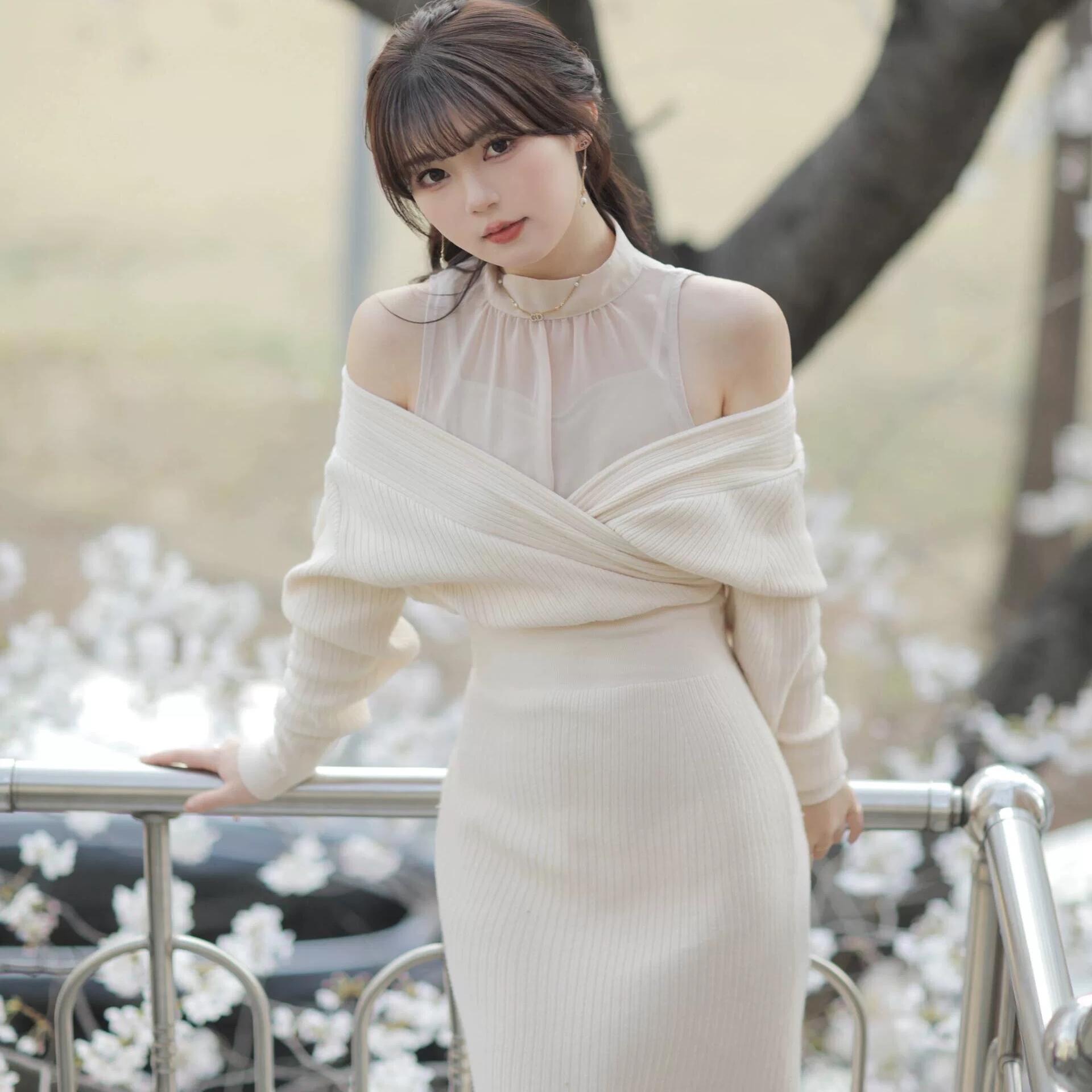 lemon丨Japanese pure desire style solid color fake two-piece shirt spliced knitted off-the-shoulder waist mermaid dress