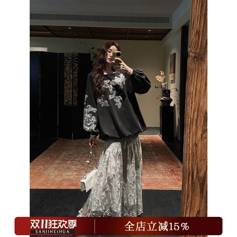 Sanji Black Flower [Hairpin on Snow] New Chinese style beaded embroidered dress with long sleeves and beautiful autumn splicing long skirt
