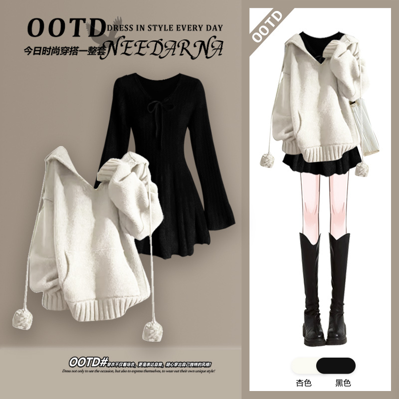 Slightly chubby waist pinch little black dress miu miu qi dress women's early autumn knitted dress set autumn and winter clothes
