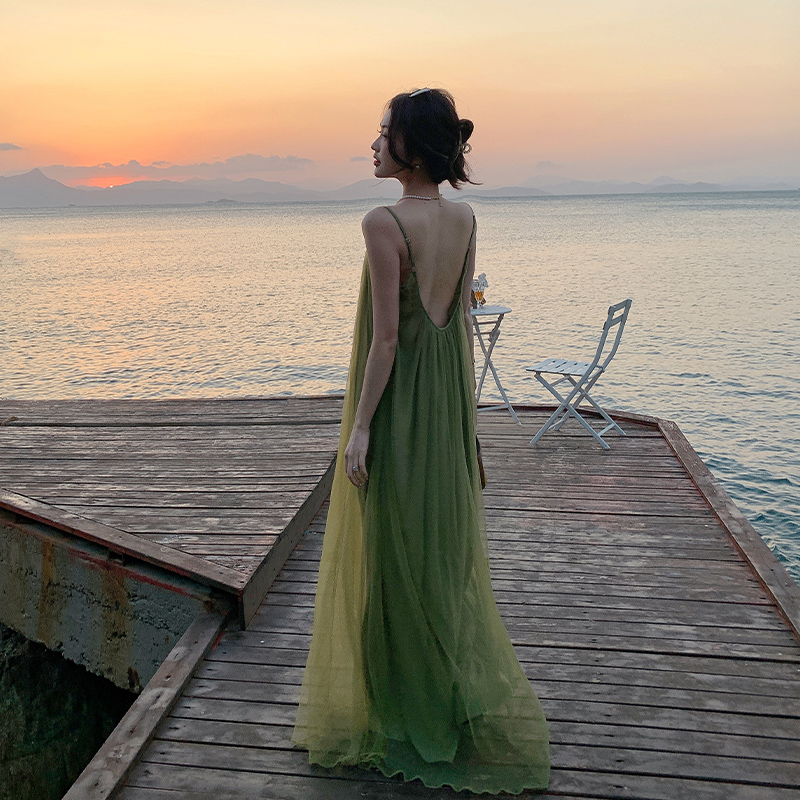 Beach lady Sanya photo shoot beach resort green beach dress sexy backless slip dress women's summer dress