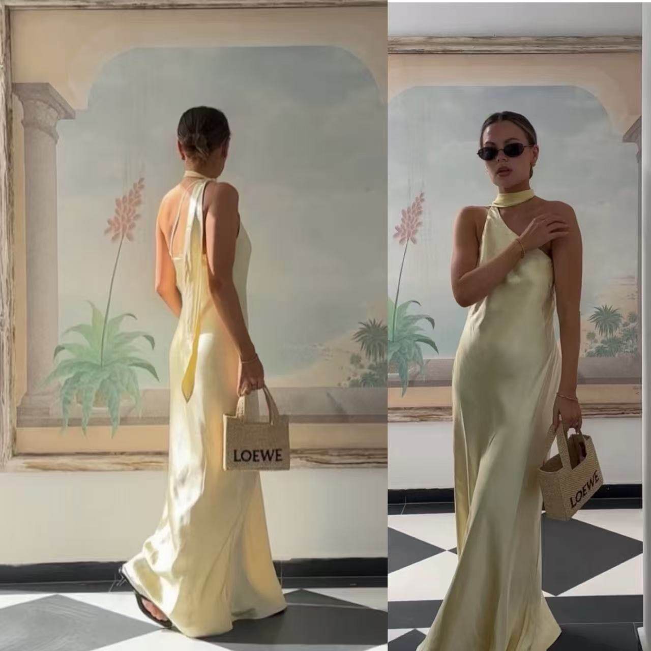 Foreign trade order 4th reck1ess pure original single slip satin texture slanted shoulder halterneck dress dress
