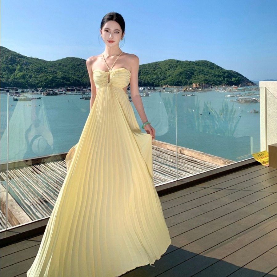 French high-end beauty, seaside resort atmosphere, backless hollow pleated halterneck dress, island resort dress