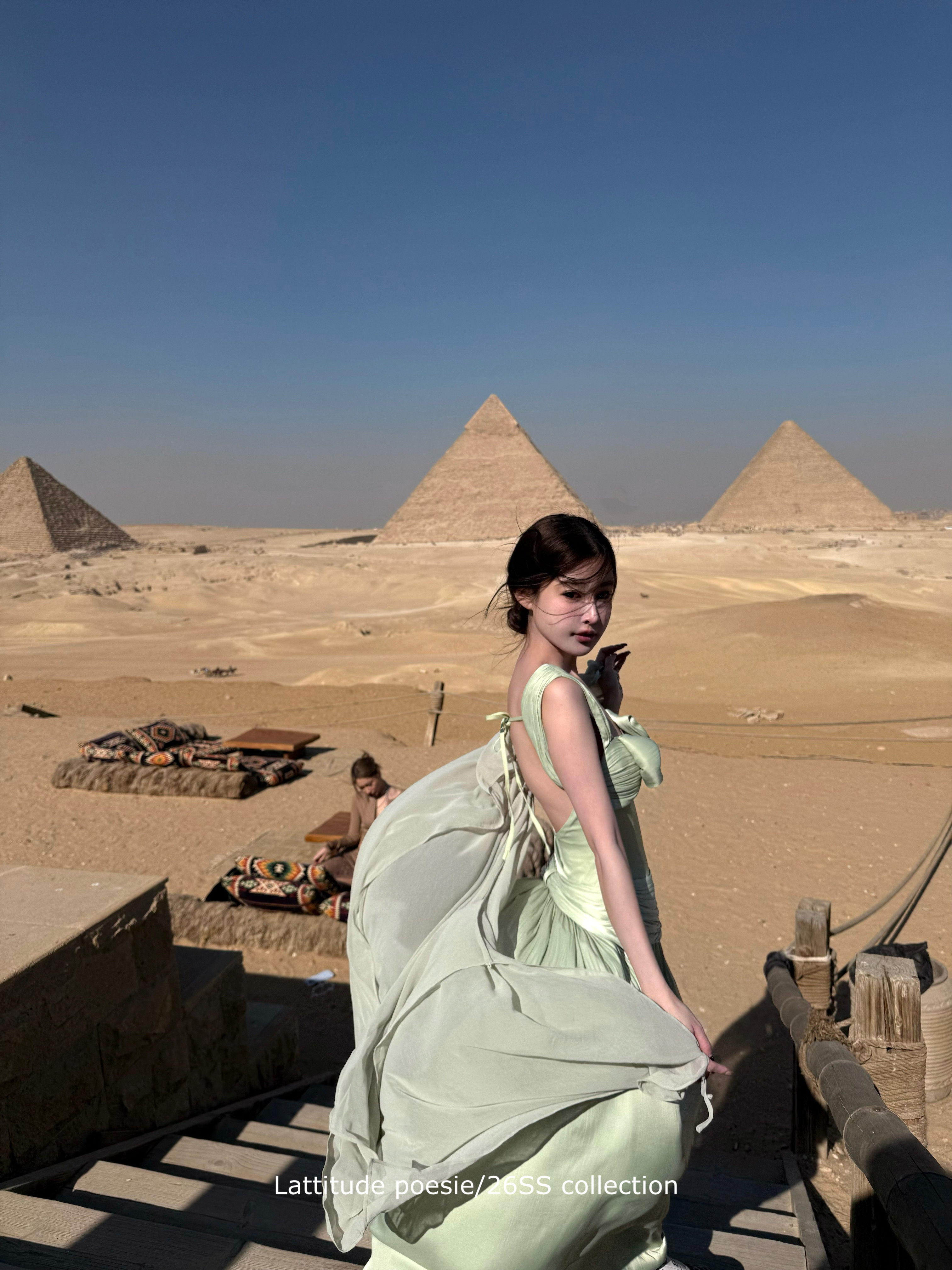 Lattitude/Yang Xiaolu Cecilia Early spring ragweed green streamer pleated backless camisole dress woman