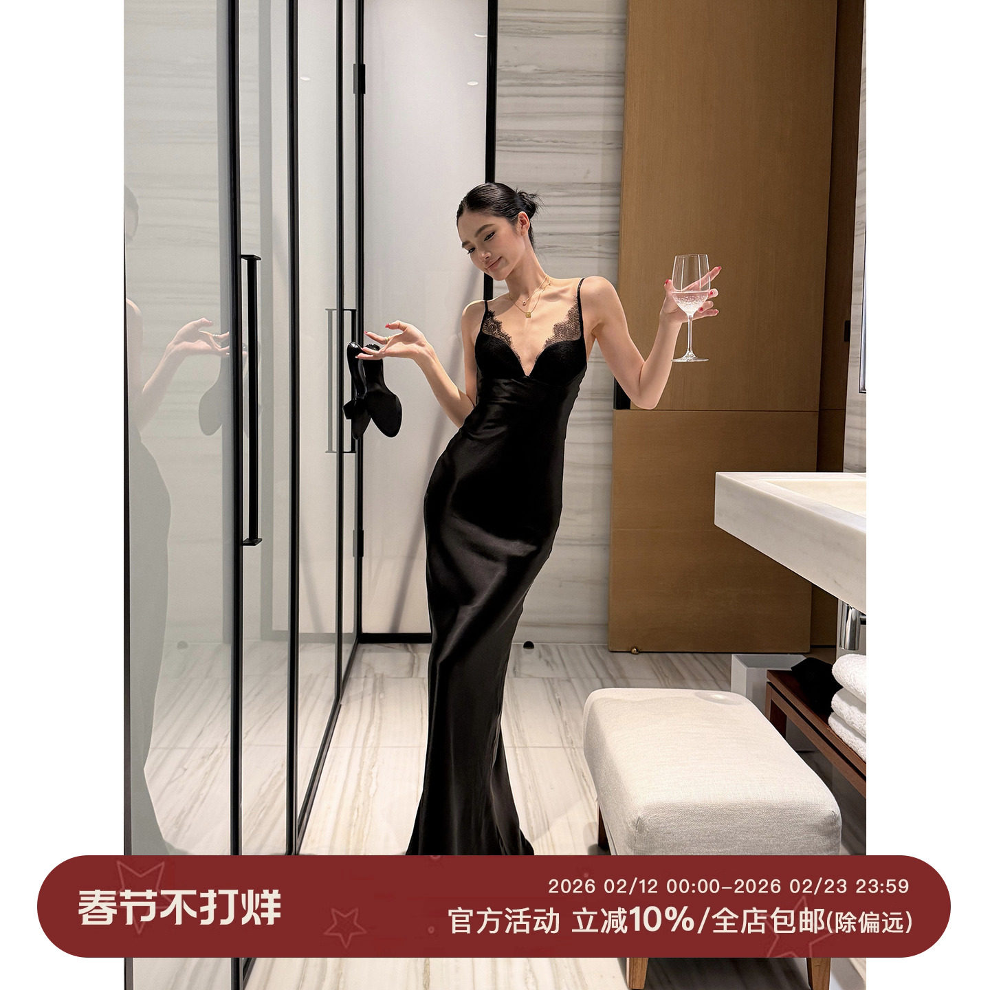 rovente streamer Swan black acetate lace camisole dress female slim fit hip wrap birthday dress maxi dress