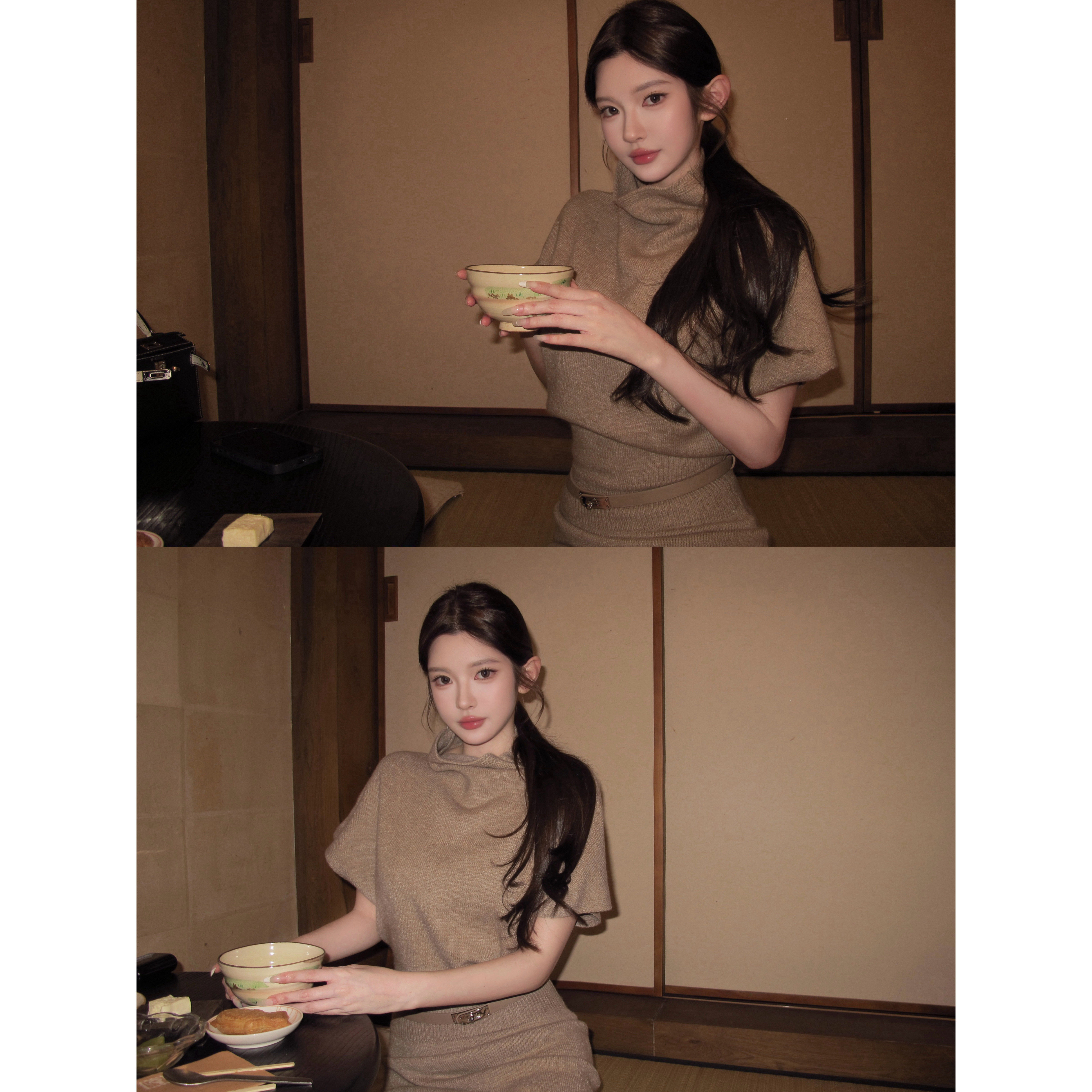 [In small quantity] CHICYOU "Daughter Korean Girl" Half-high neck belt Korean short-sleeved knit dress