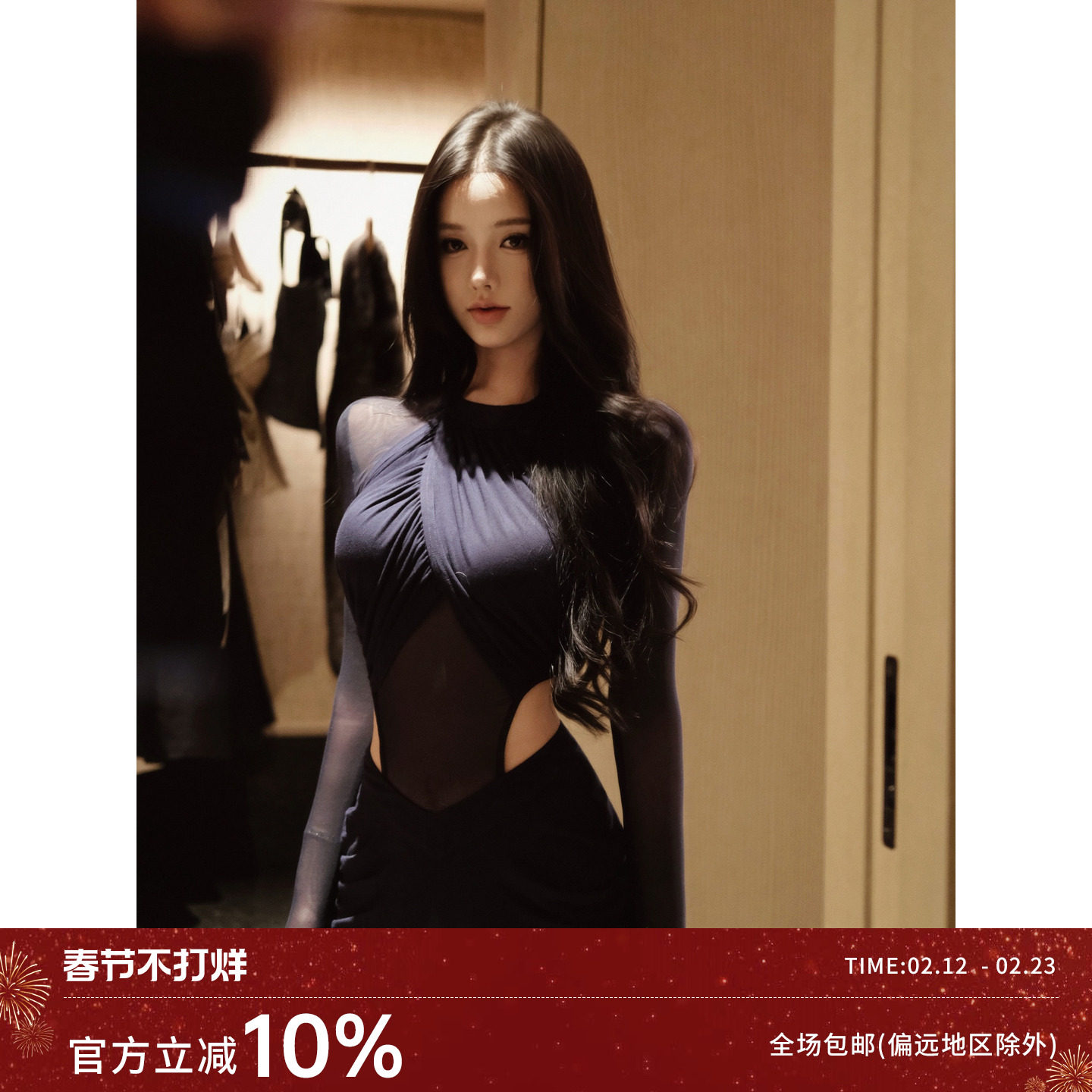 JAYKY YANG [Year-end Heavy] Mesh spliced openwork long skirt stacked draped V-shaped slim dress