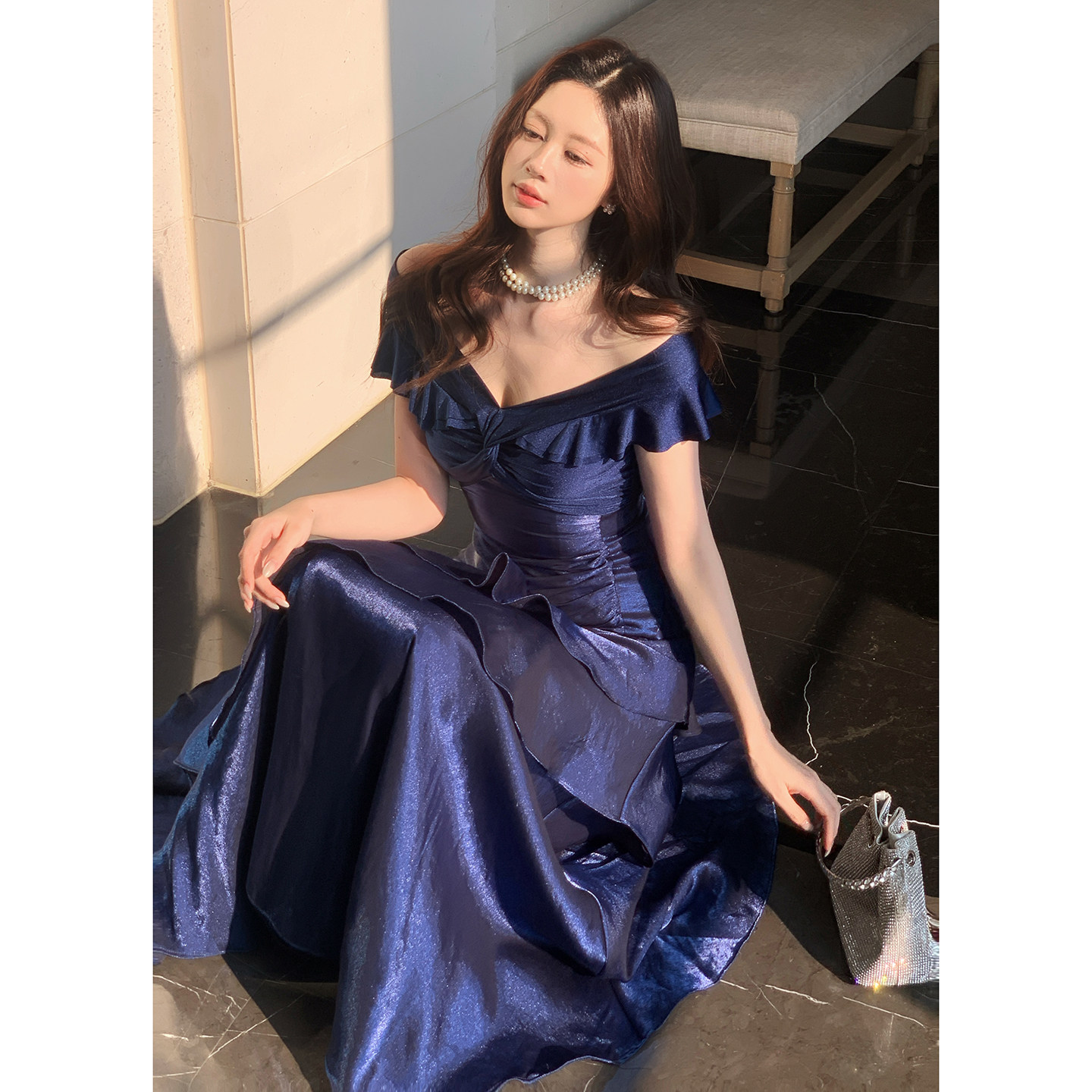 Good Job [Charlister Manor] French blue one-shoulder dress women's niche dress mermaid skirt
