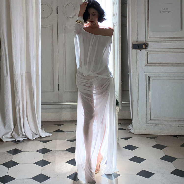 Island store sexy high-end slimming Paris Opera White Athena one-shoulder see-through dress skirt