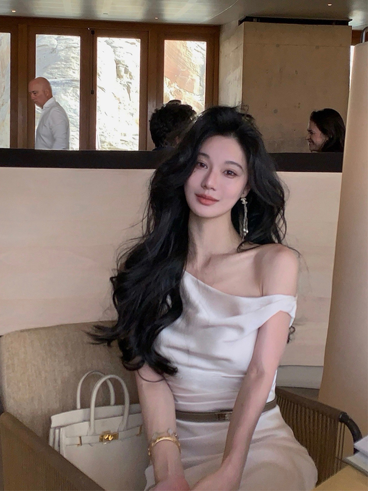 From a moment [Beverly Wife] swing neck slanted shoulder dress French temperament women's three-color waist mermaid skirt