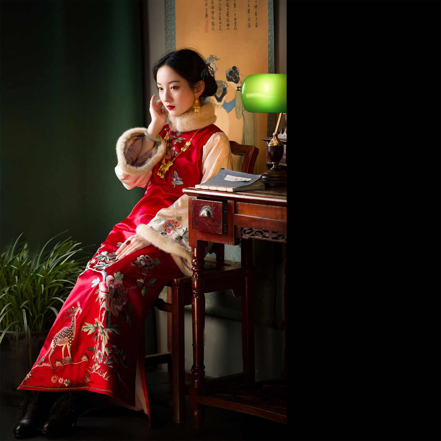 Meng Qingzhi丨A city of wind catkins丨Republic of China style embroidery hand-buckled inverted long-sleeved cheongsam skirt daily engagement toast