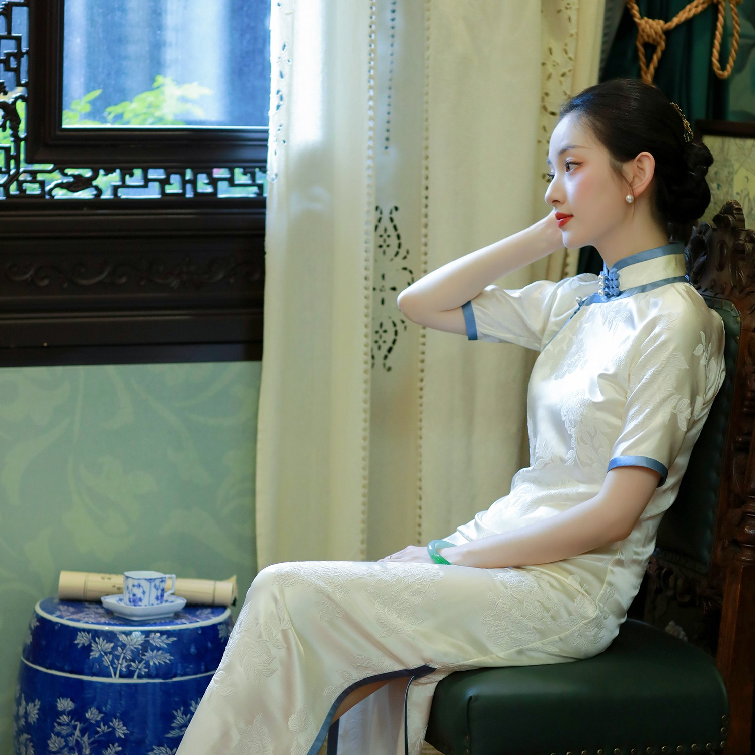 White porcelain appreciation丨A city of fluff丨Summer silk jacquard plain and elegant handmade flower buckle Chinese style cheongsam long skirt