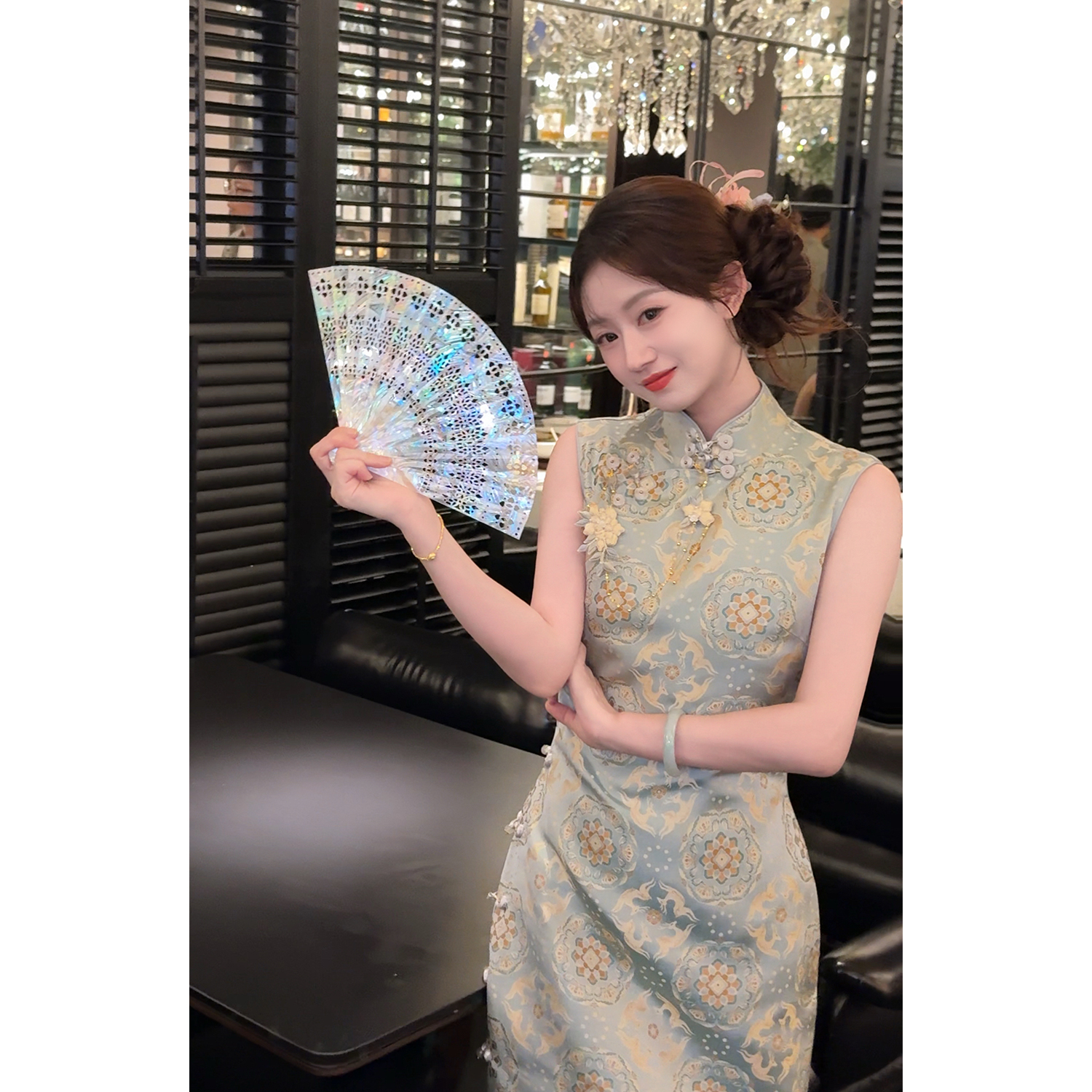 Slightly cool under the moon|Silk spinning fragrant cloud yarn on the moon on the west building, quarter sleeves are not saved, double placket, retro slim ancient cheongsam