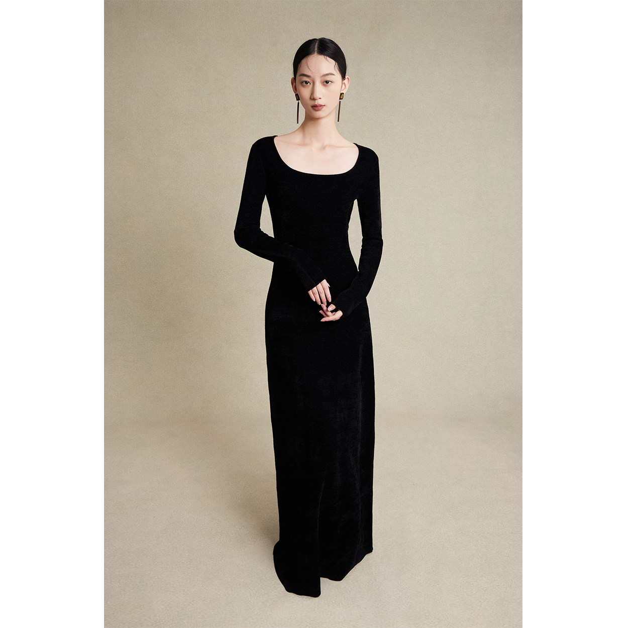 Yunshu original stretch velvet silk organza patchwork casual temperament loose crew neck long dress spring