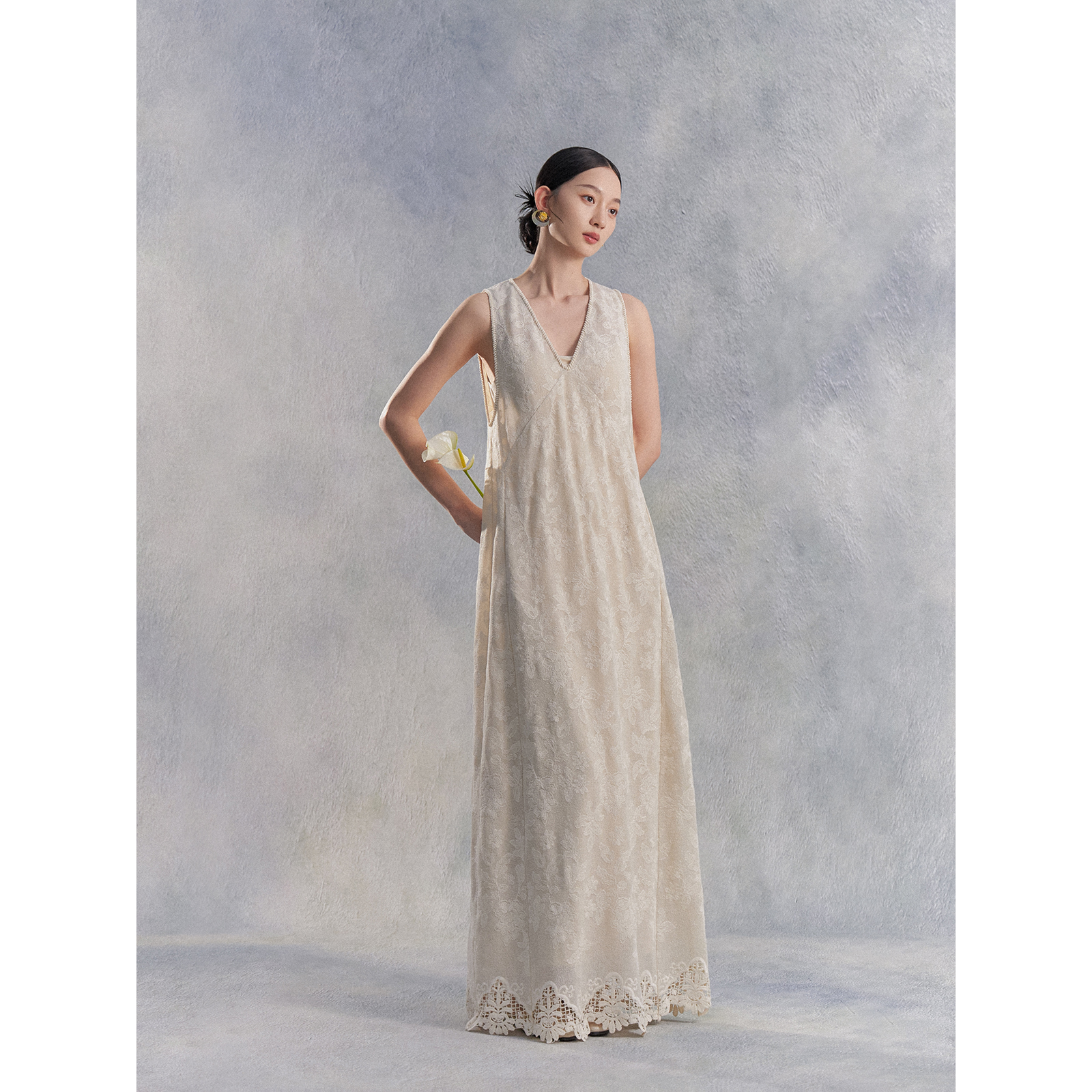 Nian Twelve【Xiaoya, Qibian】Grass and wood embroidery knitted V-neck long skirt nail bead lace Chinese dress