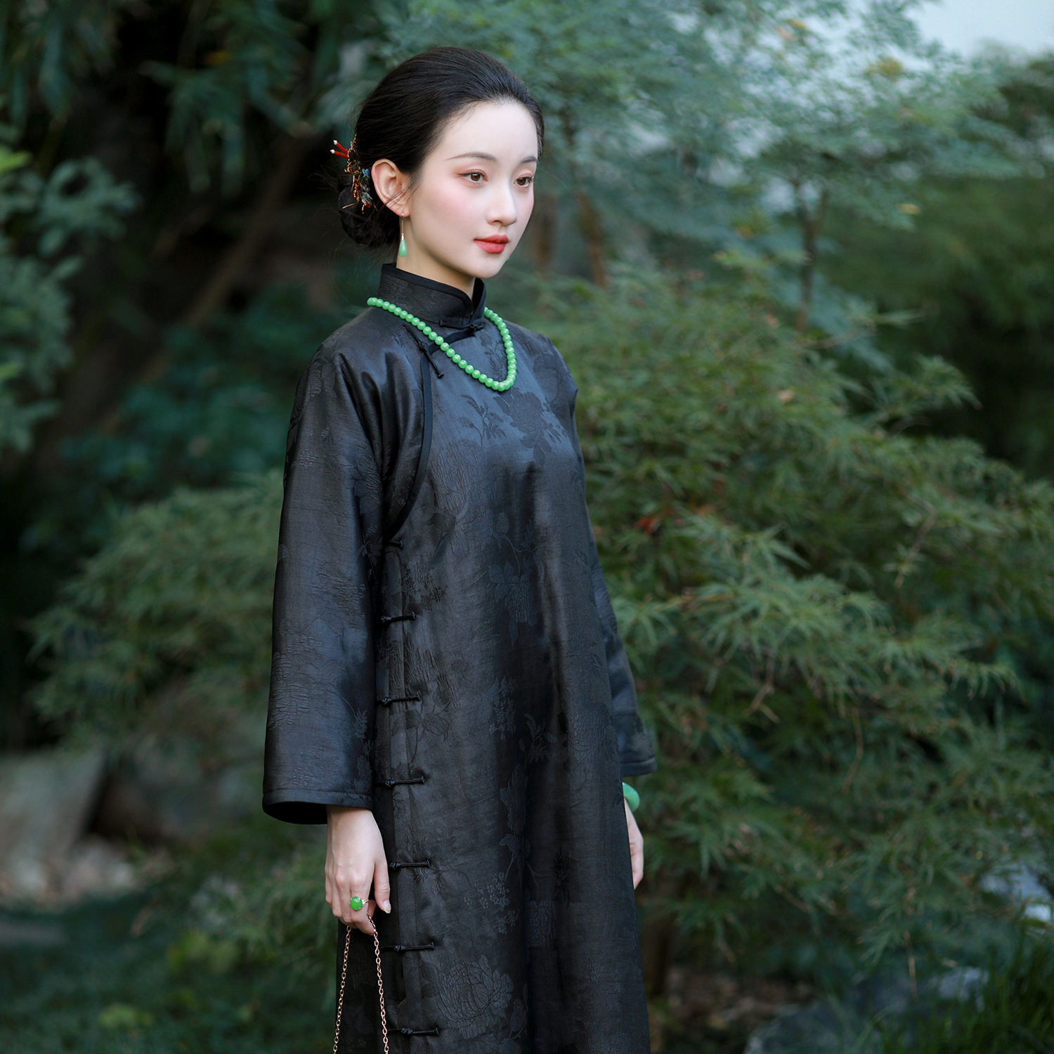 Flower Twilight Beauty丨2025 Fall/Winter New Model丨Silk heavy satin fragrant cloud gauze black retro robe Chinese cheongsam skirt