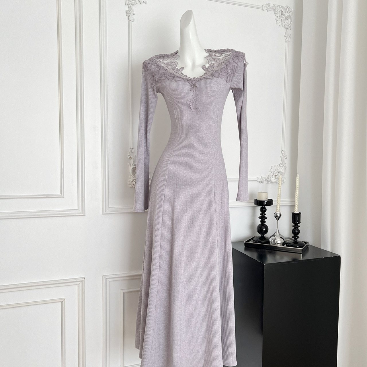 Peach homemade I don't know the snow, gentle atmosphere, lace V-neck knitted dress, waist slimming, A pendulum long skirt