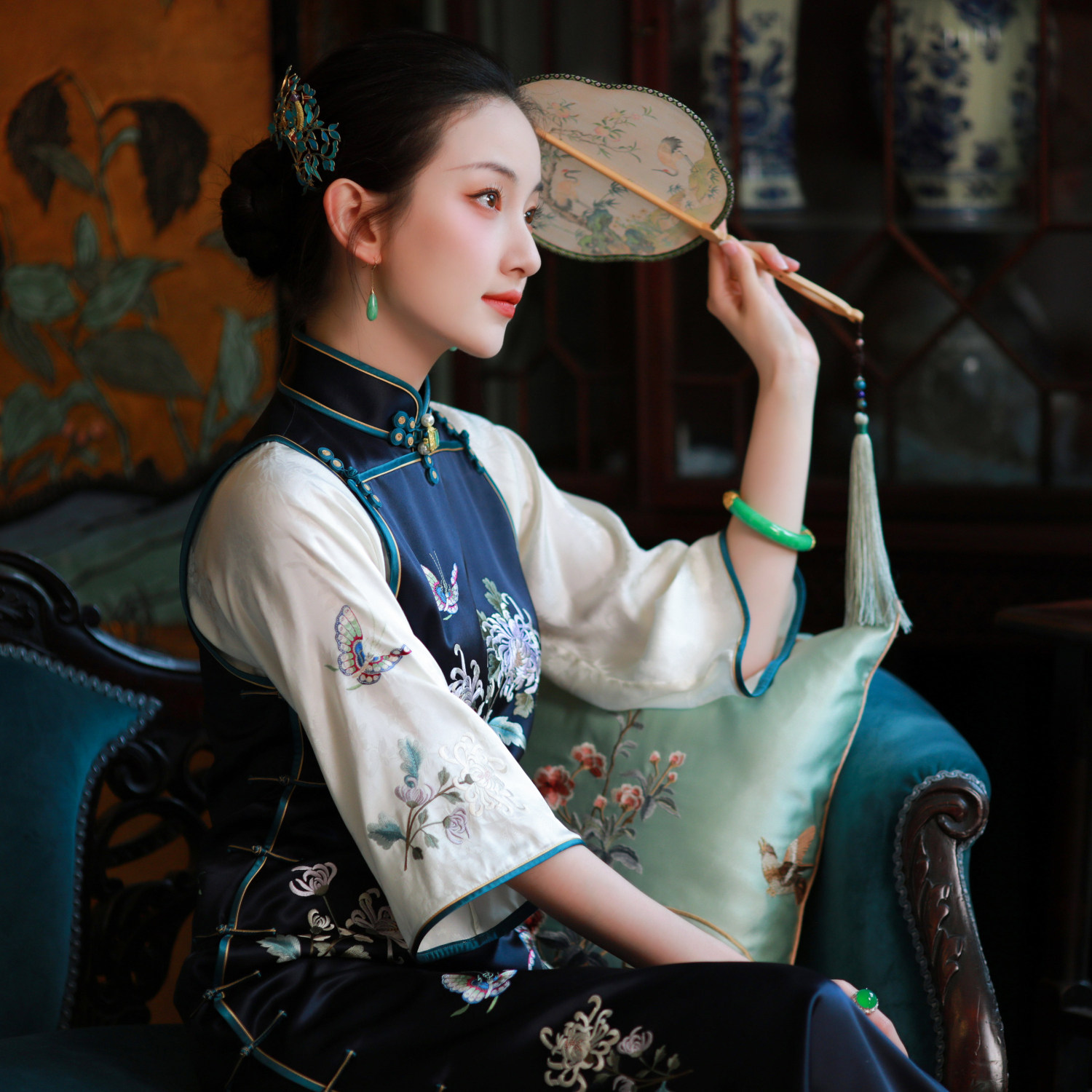 Chrysanthemum Shadow Qinghuan丨A city of wind丨Spring and summer Chinese style Republic of China style heavy industry embroidery fake two inverted large-sleeved cheongsam skirts