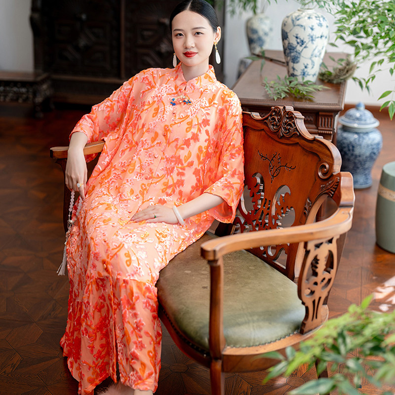 2025 new products PSL1498 bright orange red stand-up collar, loose long cheongsam, morning robe, sober dress, retro dress, spring and summer