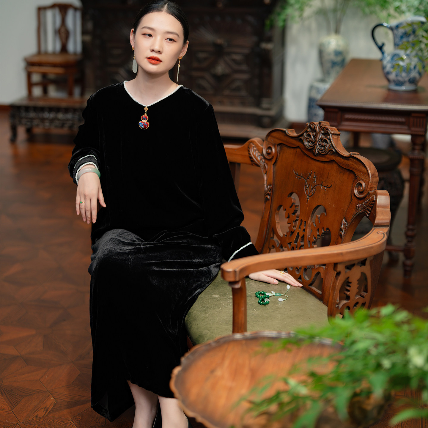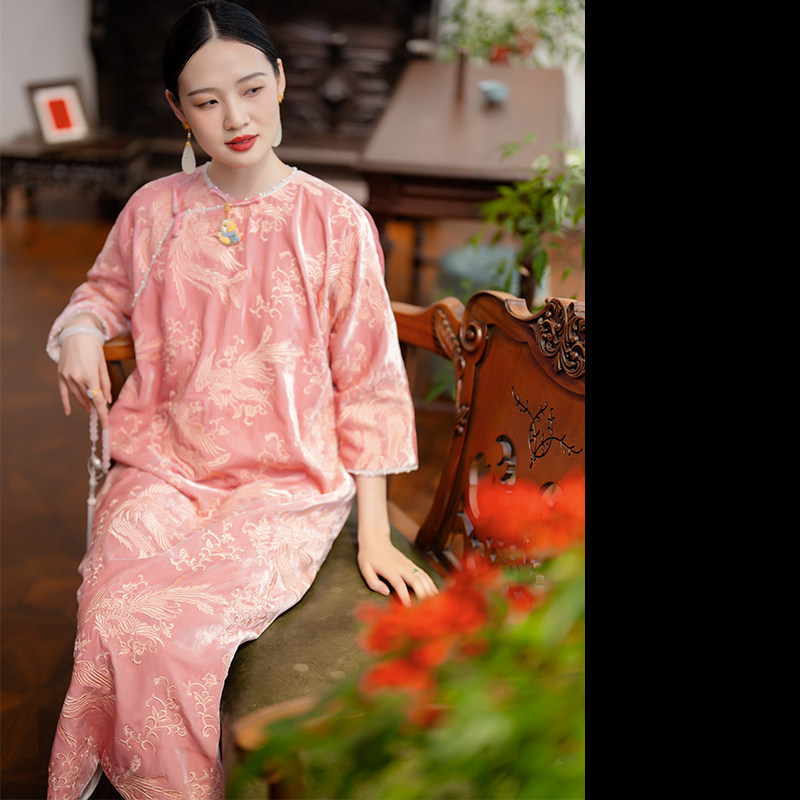 2025 New Arrivals PCY2166 Silk Velvet Embroidered Pearl Edge Loose Robe Crew Neck Cheongsam Dress Spring and Autumn