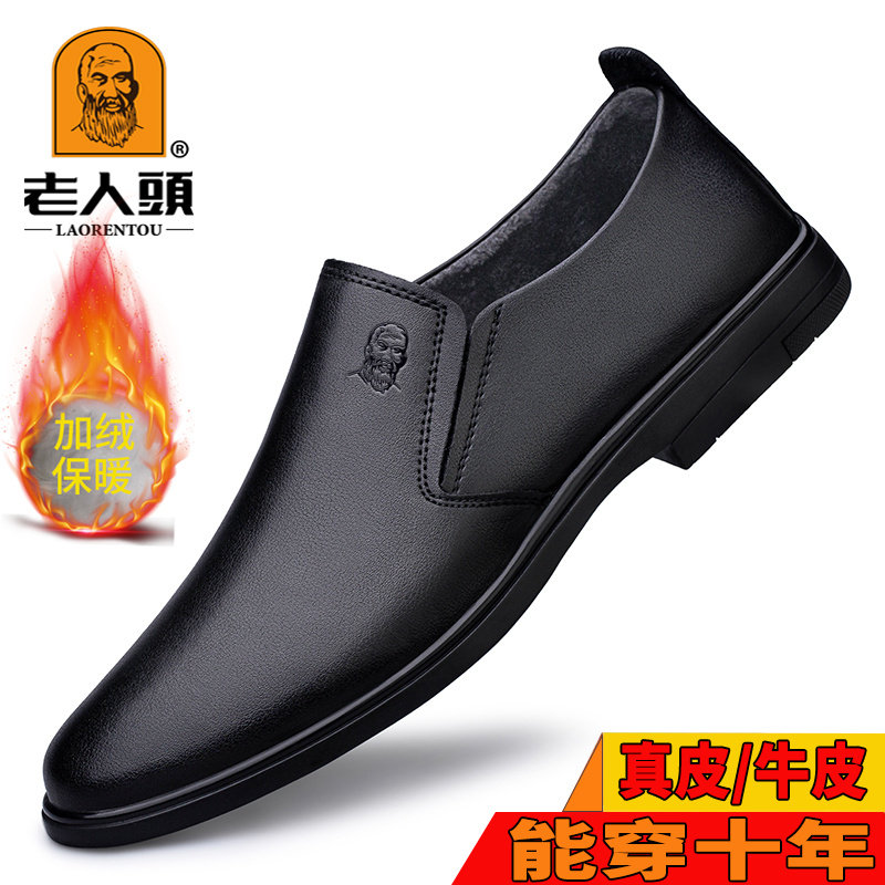 Old man head men's shoes autumn and winter fleece 2025 new men's business casual shoes genuine leather soft soles and cotton leather shoes