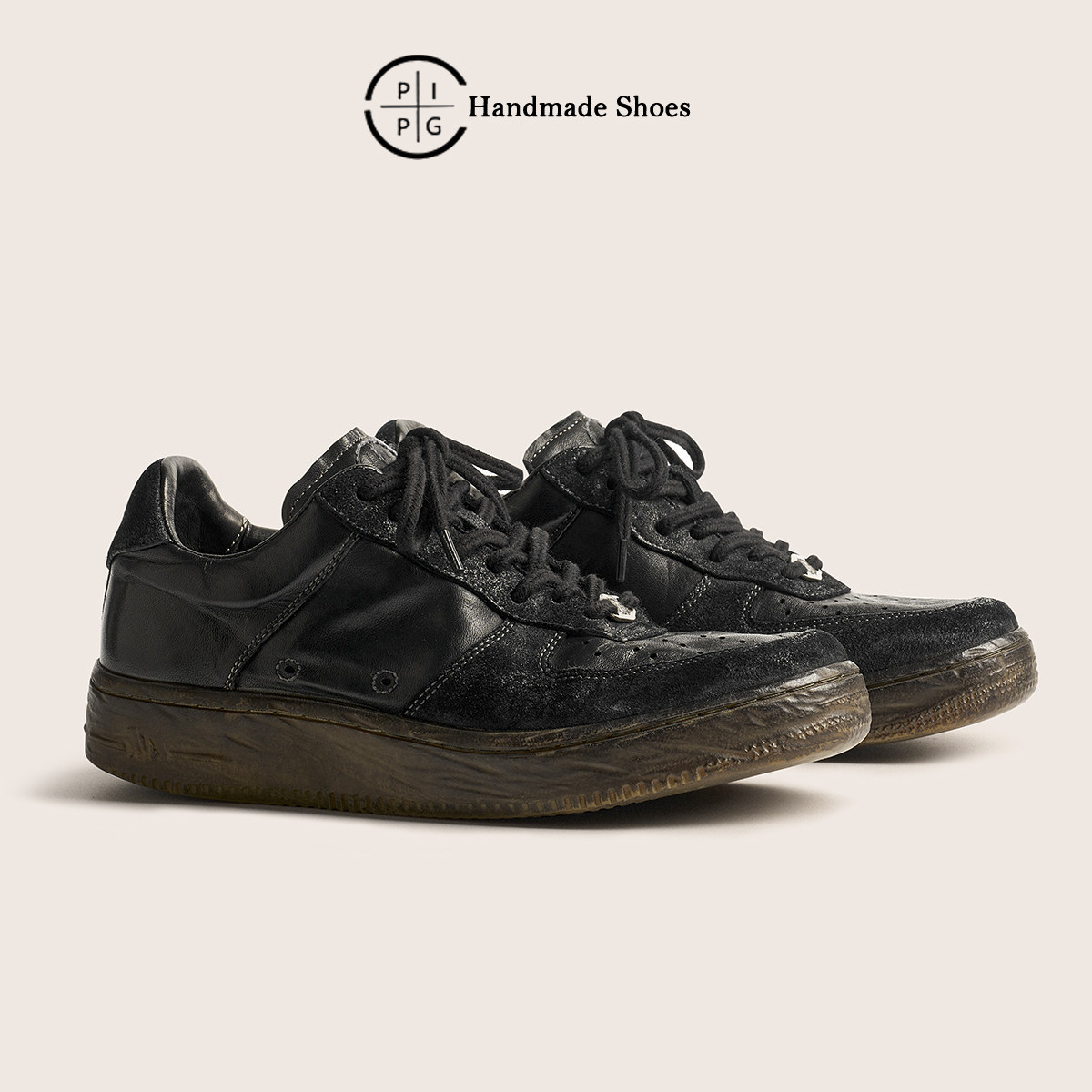 PIPG men's and women's shoes niche original design handmade black leather shoes vintage athleisure board shoes washed horse leather