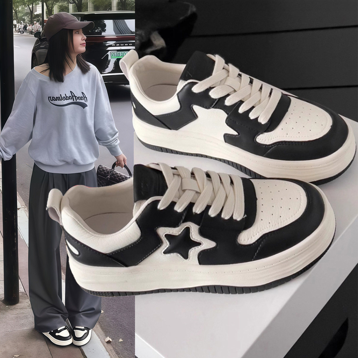 Hong Kong Genuine Leather Starboard Shoes Women's 2026 Spring New Muffin Platform Shoes Black and White Panda Casual White Shoes