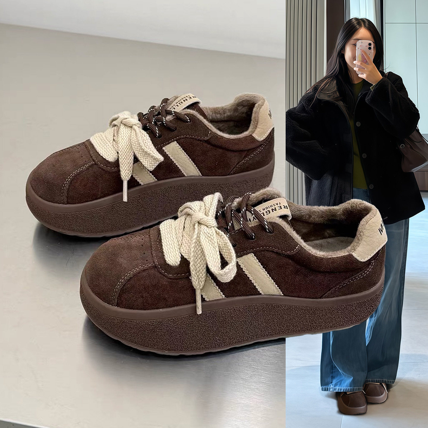 Hong Kong fleece warm thick-soled German training shoes women's 2026 autumn/winter Maillard retro double shoelaces leather casual board shoes