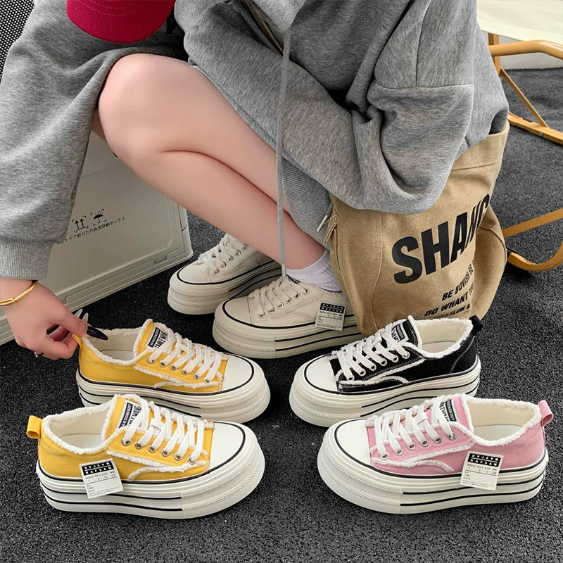 Hong Kong Versatile Lightweight Sports White Shoes Spring New Lace-up Round-toe Casual Shoes Platform Sole Muffin Canvas Shoe Girl