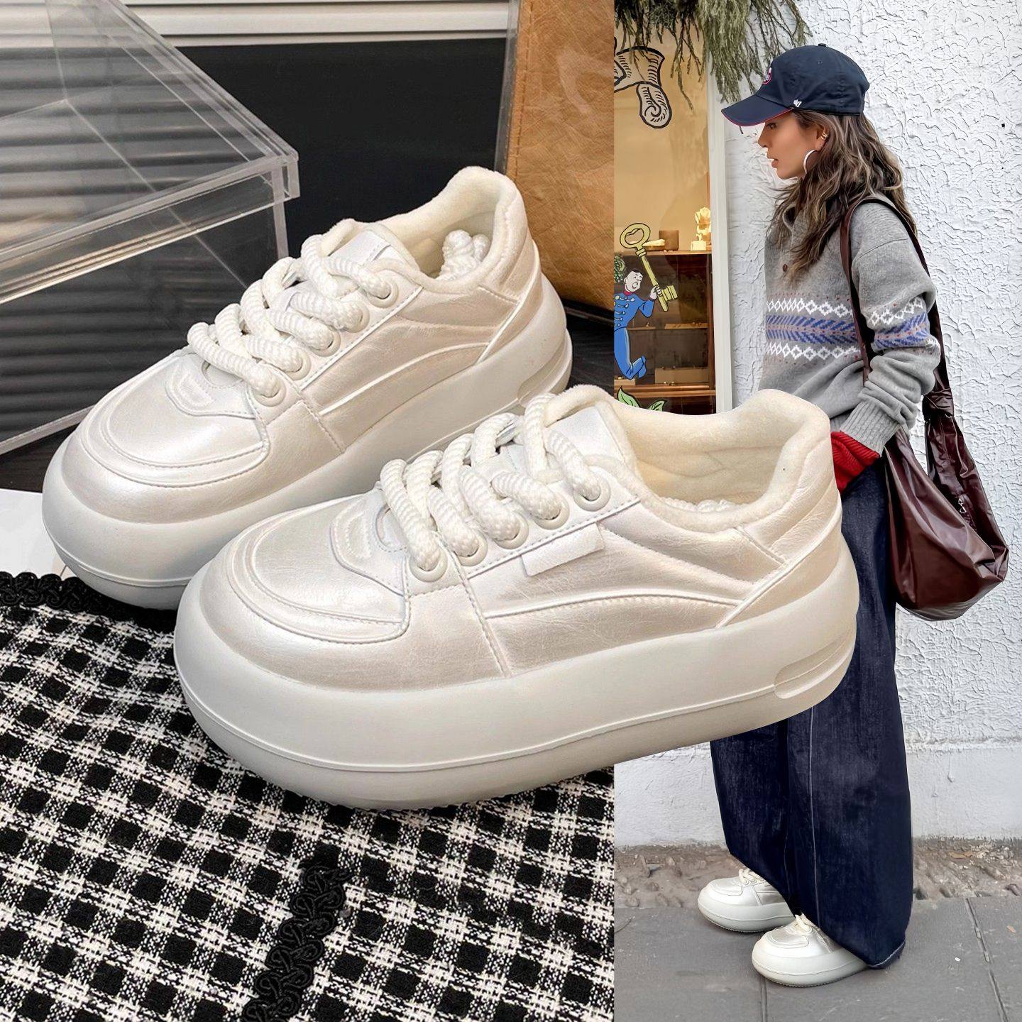 Hong Kong leather versatile fleece casual white shoes women's 2026 autumn new Korean muffin thick-soled heightening sneakers