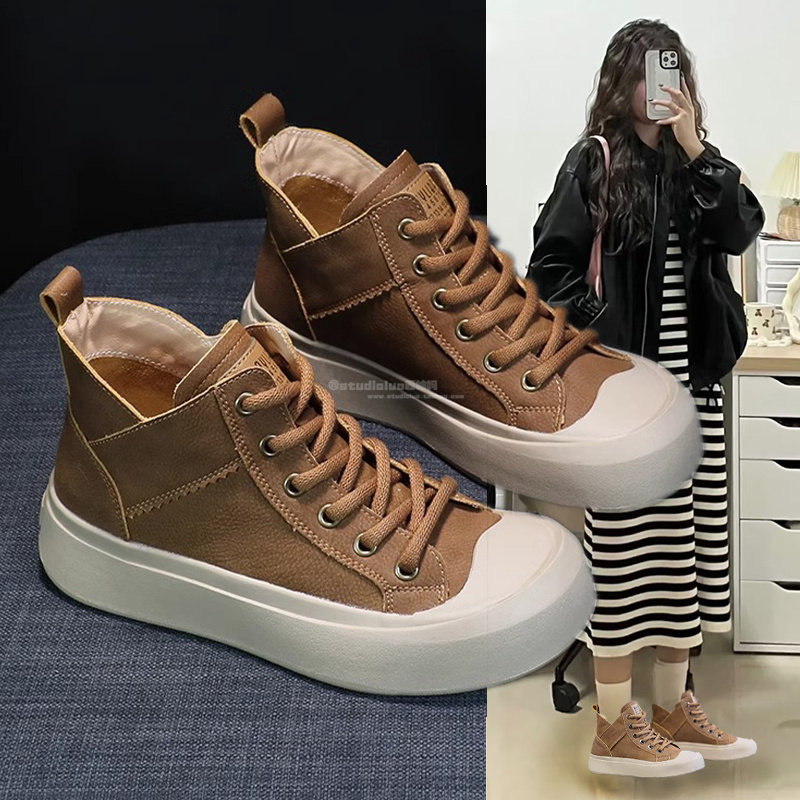 Hong Kong leather casual board shoes 2026 spring and autumn new versatile retro high-top plus size women's shoes 41 flat boots 43
