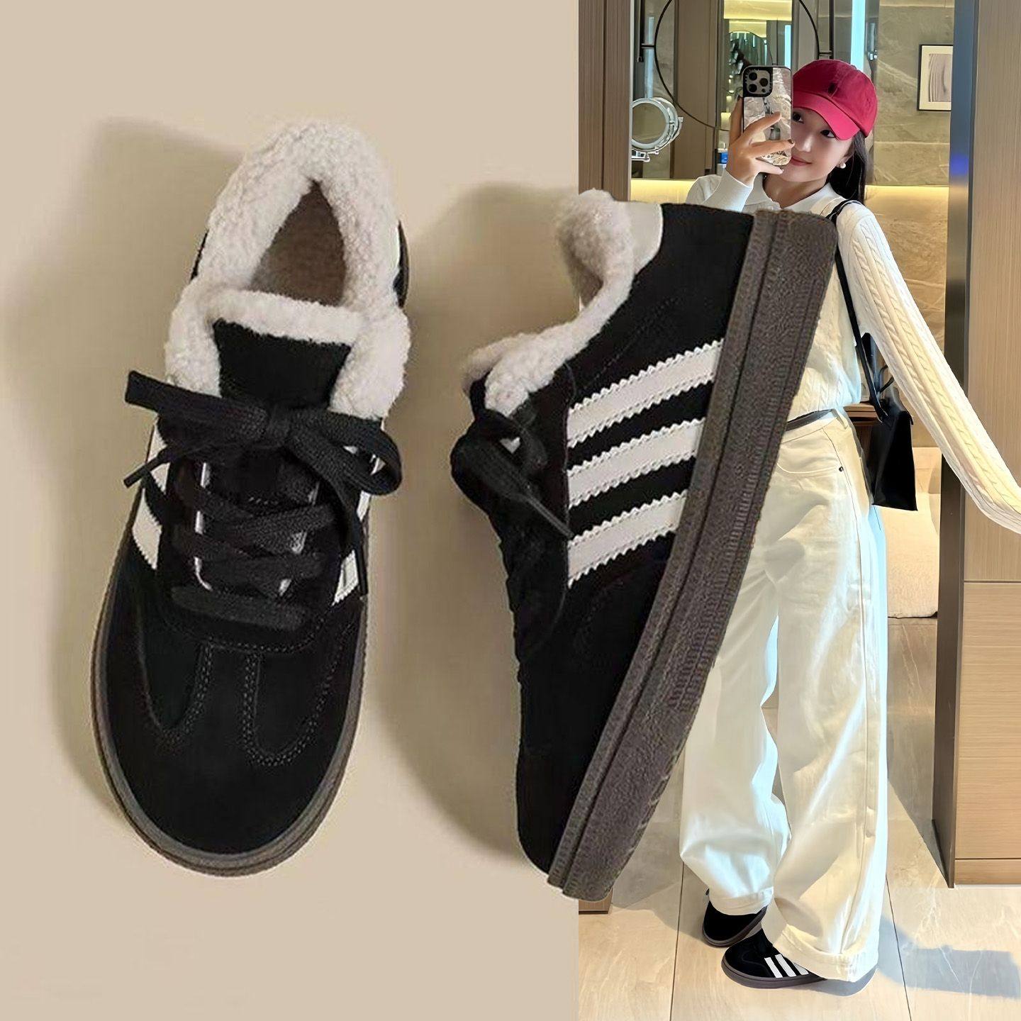 Hong Kong genuine leather lambswool German training shoes women's 2025 autumn and winter new fleece flat Forrest Gump sports and leisure board shoes