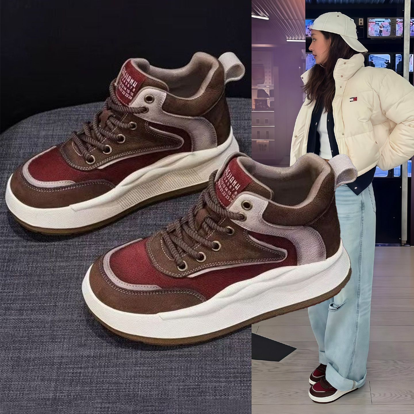 Hong Kong retro high-top shoes women's 2025 spring and autumn new fleece platform leather color-blocking sports casual shoes ins trend