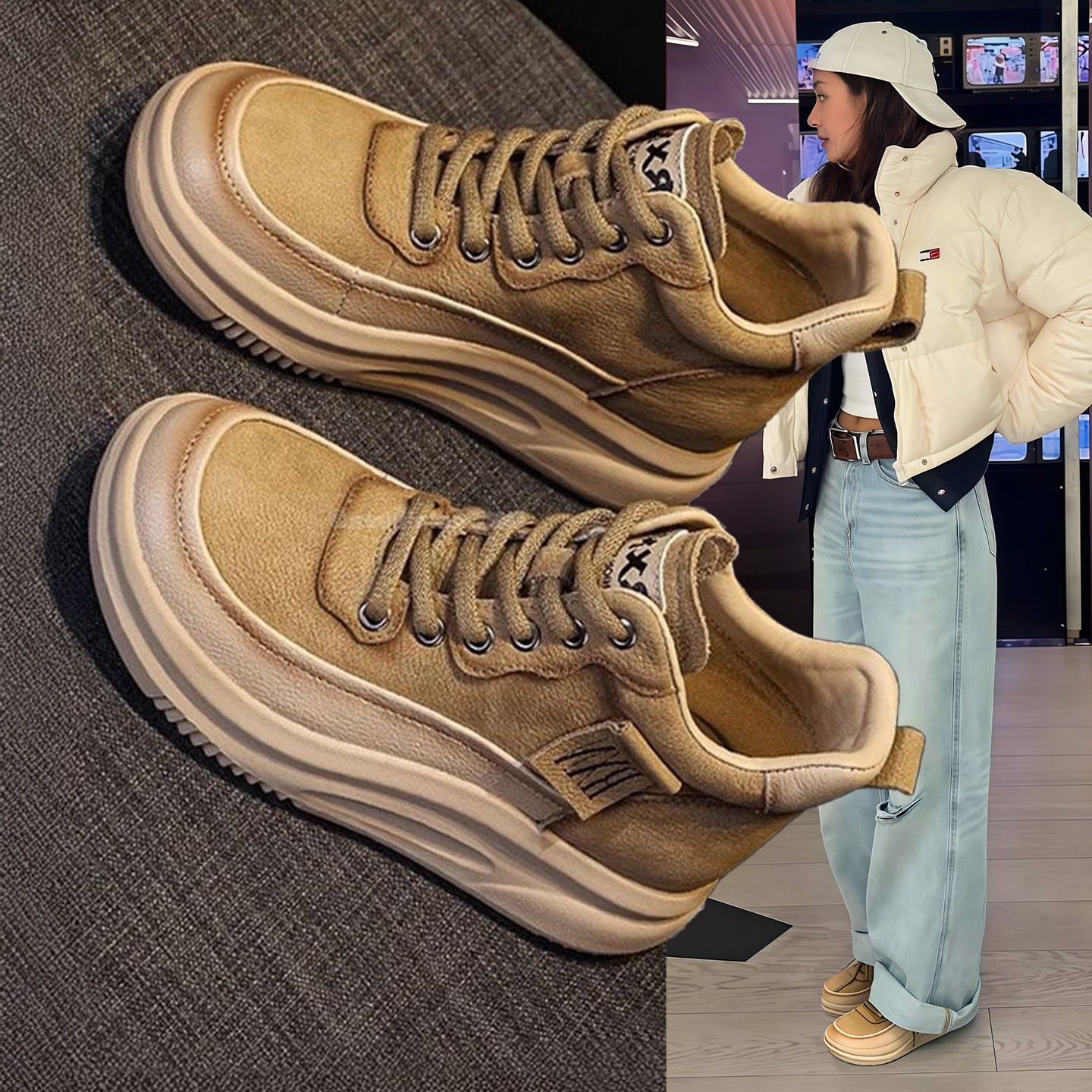 Hong Kong leather heightened platform fashion high-top shoes women's 2025 spring and autumn fleece warm small man sports casual shoes